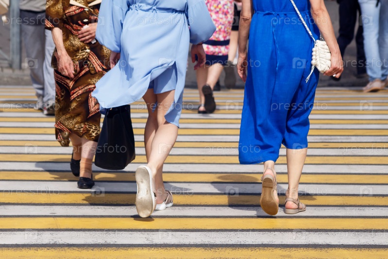 Люди переходят дорогу по пешеходному переходу. ноги крупным планом. на открытом воздухе в солнечный летний день