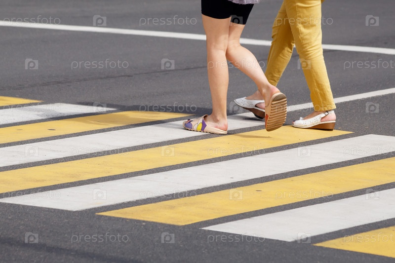 Люди переходят дорогу по пешеходному переходу. ноги крупным планом. на открытом воздухе в солнечный летний день