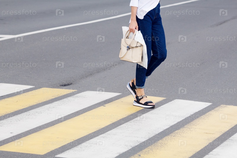 Люди переходят дорогу по пешеходному переходу. ноги крупным планом. на открытом воздухе в солнечный летний день