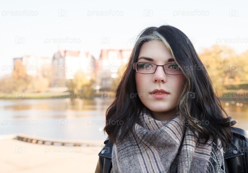 Портрет юной брюнетки в черной куртке в городском парке в солнечный осенний день