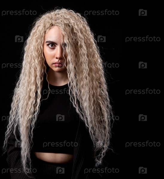 Портрет молодой блондинки с длинными вьющимися волосами в студии на черном фоне