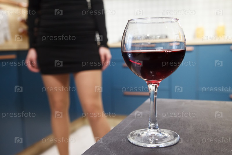 Бокал вина стоит на столе на кухне. молодая женщина стоит за столом