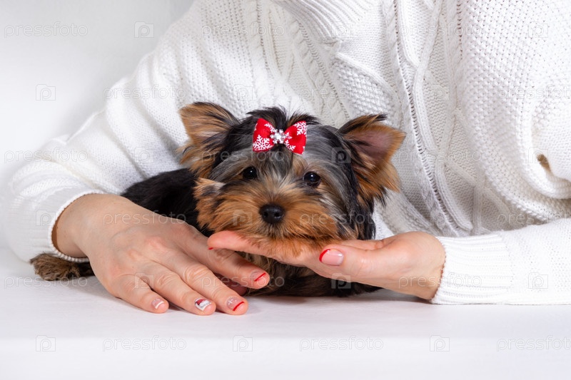 Щенок йоркширского терьера лежит в руках хозяина. Понятие о доверии собаки к человеку