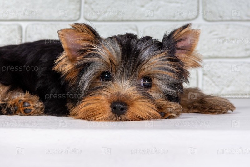 Щенок йоркширского терьера спит и смотрит в камеру