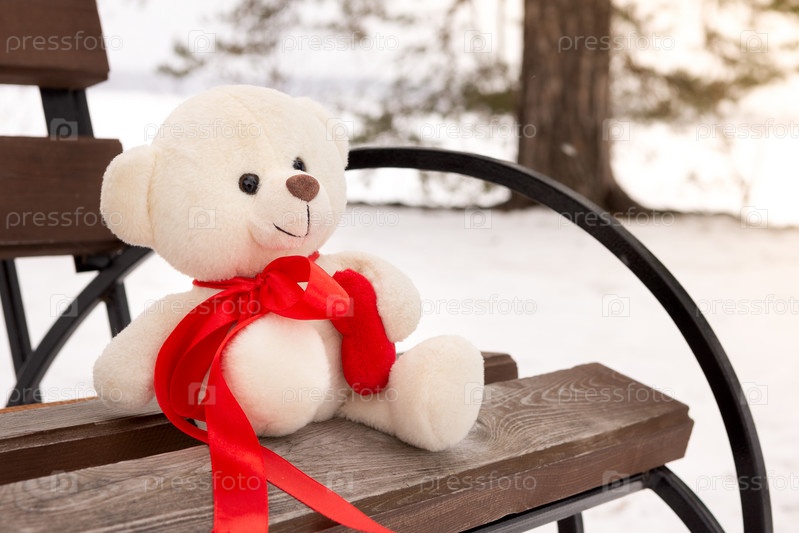 Грустный плюшевый мишка зимой, потерянный и забытый. Плюшевый мишка один на скамейке зимой