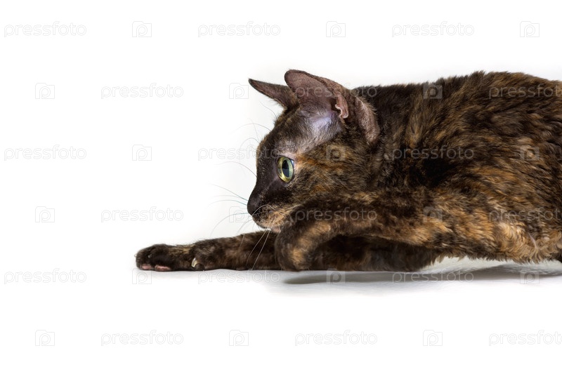 Очаровательный кучерявый кот Урал Рекс крадется по полу и смотрит на добычу большими зелеными глазами.. Окрас черепаха черный. Концепция редкой породы кошек и эксклюзивного питомца