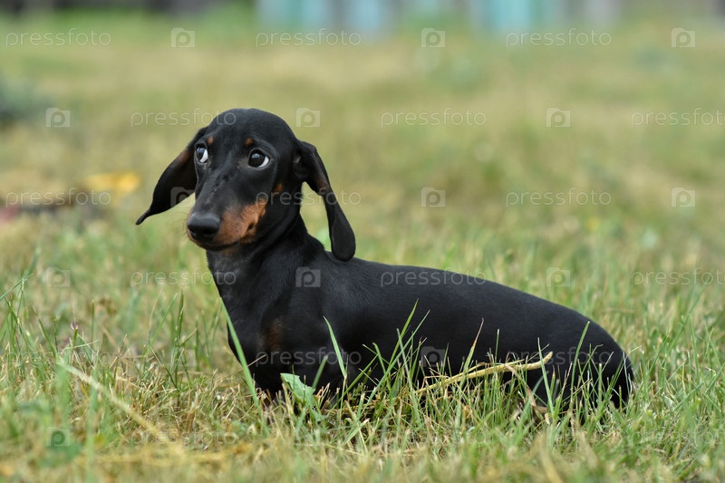 Портрет собаки таксы черного окраса на траве