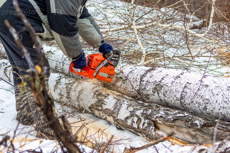 Крупный план дровосека, распиливающего дерево бензопилой зимой. 18 января 2020 г., Челябинск, Россия