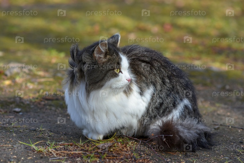 На земле у кошки есть еда и она с нетерпением ждет