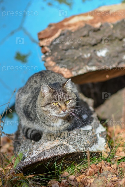 На земле у кошки есть еда и она с нетерпением ждет
