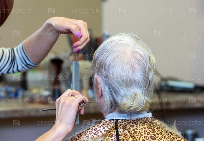 Челябинск, Россия, 18 марта 2019 г. Стрижка для пожилых людей. Процесс стрижки в парикмахерской