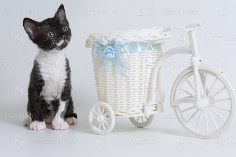 Маленький котенок Урал Рекс сидит рядом с игрушечным велосипедом и смотрит вверх, изолированный на белом фоне. Окрас: черный биколор. Понятие о редкой породе кошек и очень ласковых питомцах