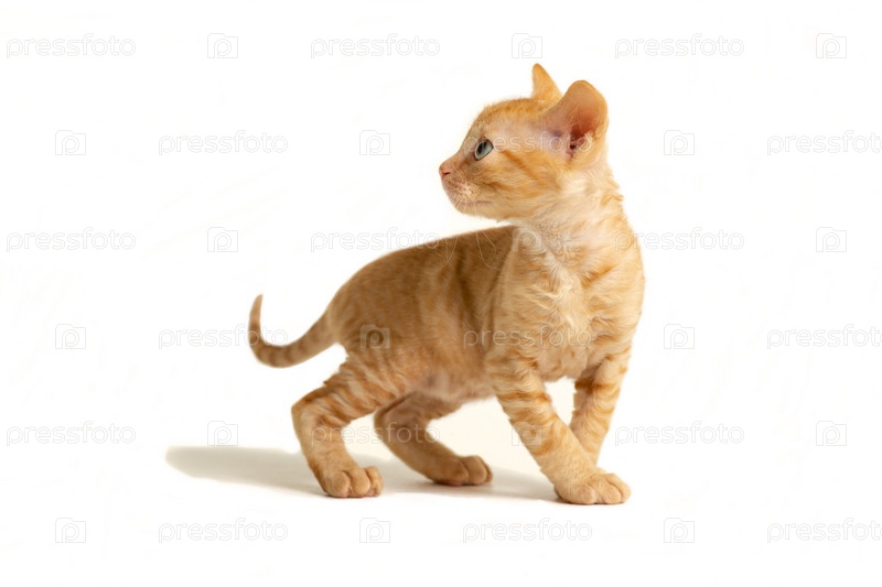 Маленький котенок Урал Рекс стоит и оглядывается назад, изолированный на белом фоне. красный цвет