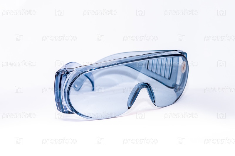 Синие пластиковые защитные очки на белом фоне изолированы, крупным планом. Концепция охраны труда и здоровья глаз