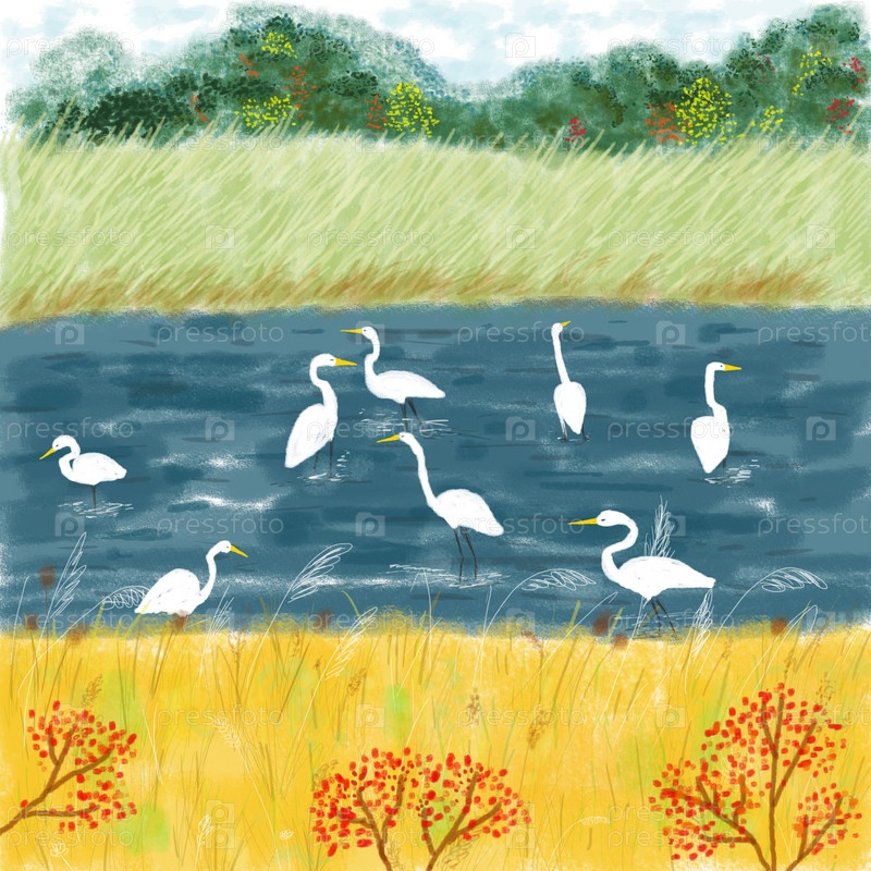 Осенний пейзаж с белыми цаплями в озере. Цифровая иллюстрация