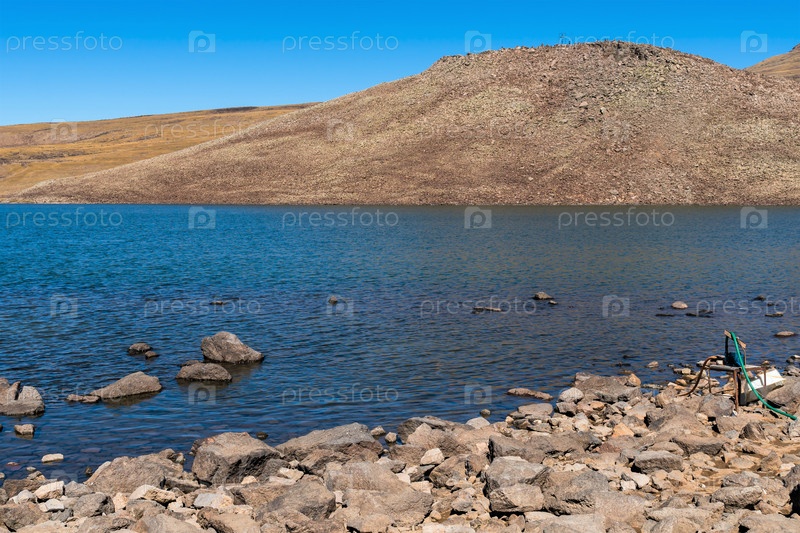 Скалистый берег и вид на небольшое озеро в горах Армении
