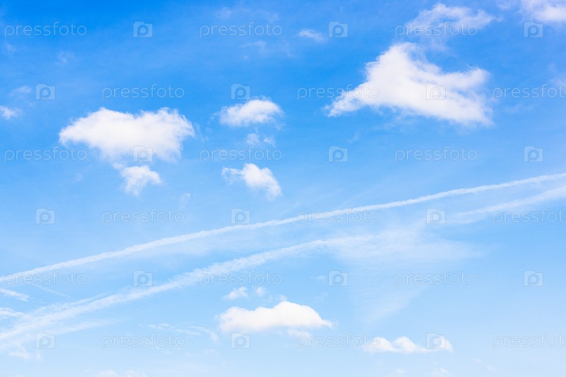 Старый инверсионный след между кучевыми облаками в голубом небе