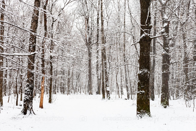 Заснеженная тропа в заснеженном лесу во время снегопада