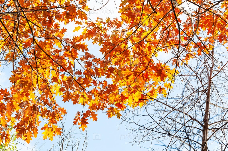 Оранжевые листья красного дуба под голубым небом