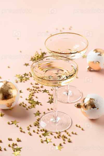 Новогоднее шампанское и рождественские золотые безделушки на белом фоне