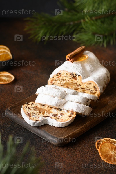 Рождественский традиционный штоллен - немецкий кекс на коричневом фоне
