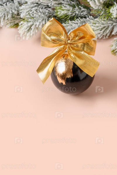 Рождественская праздничная черная безделушка украшена золотым листом на розовом фоне с копировальным пространством. Роскошный металлический стиль. Вертикальная открытка
