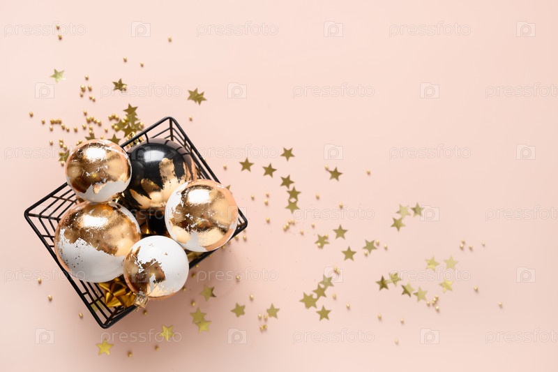 Рождественские шары с золотым поталью на розовом фоне с копией пространства