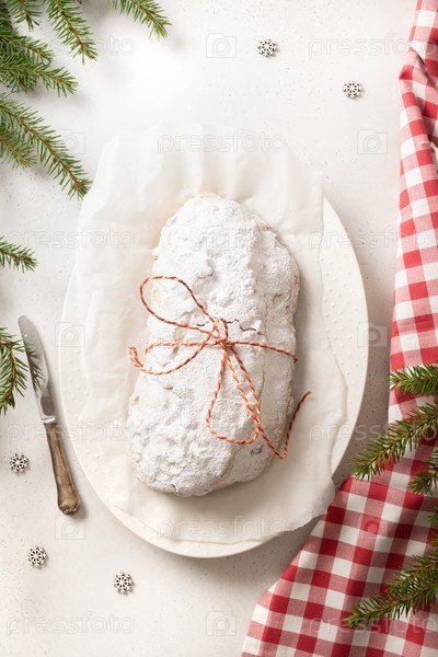 Рождественский столлен - немецкий хлеб на белом фоне. Вертикальный формат