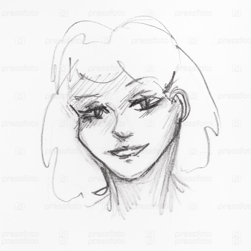 Эскиз счастливой молодой женщины, нарисованный карандашом