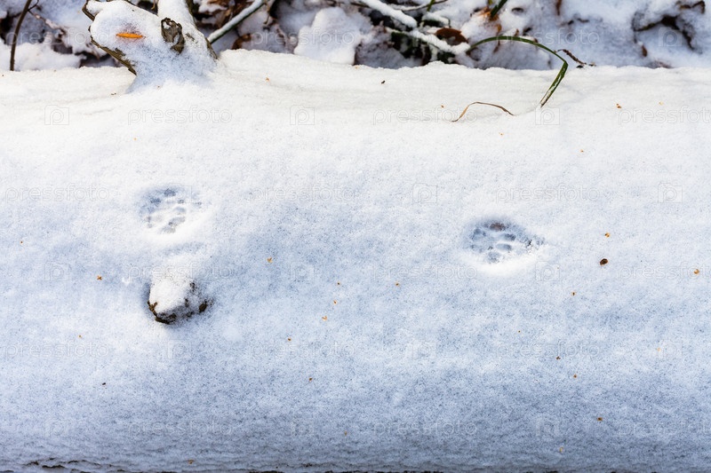 Кошачьи шаги на первом заснеженном стволе дерева