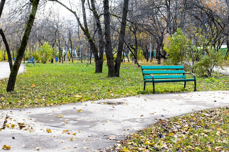 Мокрая дорожка и пустая зеленая скамейка в парке осенью