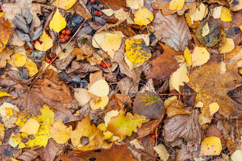 Вид сверху на мокрые различные опавшие листья поздней осенью