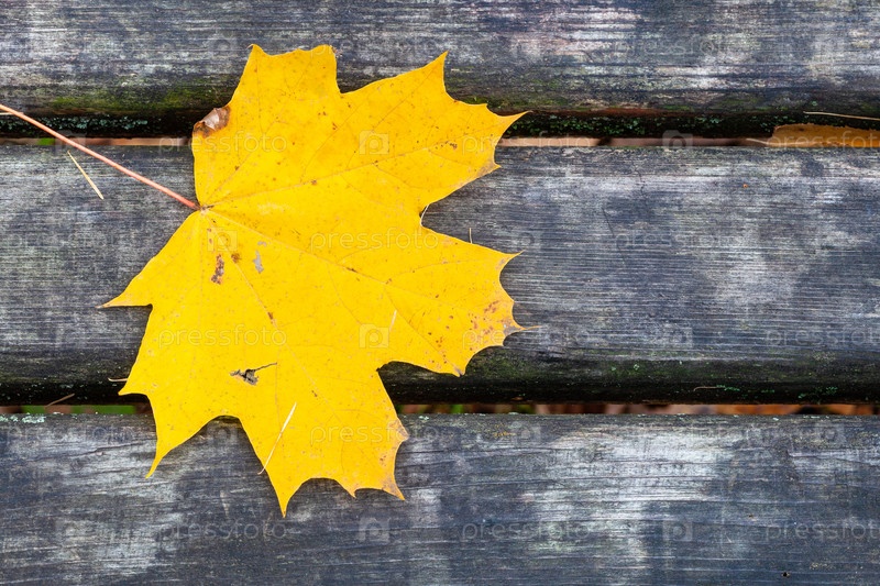 Желтый кленовый лист на мокрой серой скамейке в городском парке