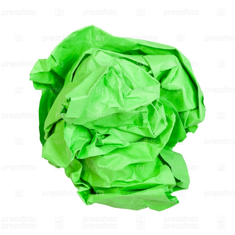 Мятый шарик из зеленой бумаги, изолированный на белом