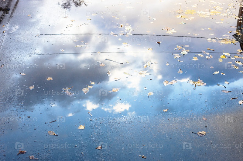 Дождевая лужа на поверхности асфальтовой дорожки осенью