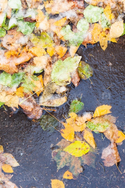 Много опавших листьев, скованных льдом в замерзшей луже