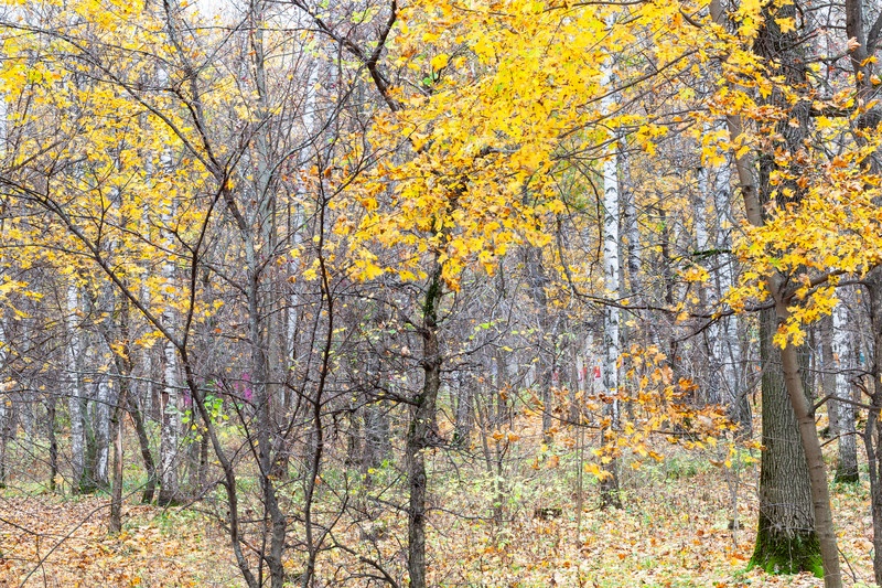 Желтые листья клена и голых деревьев в городском панке