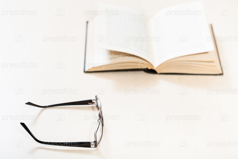 Очки и открытая книга на бледном столе