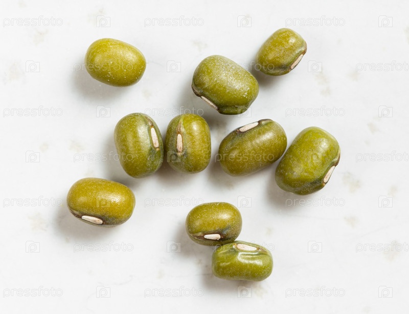 Несколько сырых зеленых бобов мунг крупным планом на сером