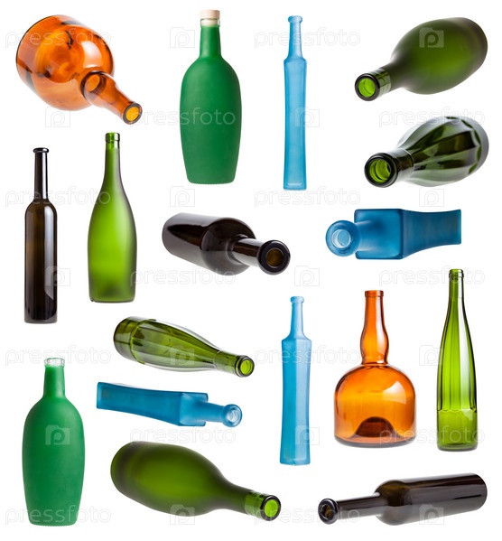 Набор стеклянных бутылок разного цвета, изолированных