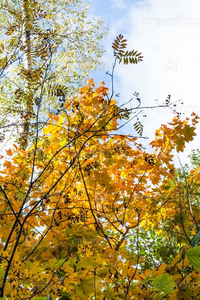 Вид на рябину, березу и клен в осеннем лесу