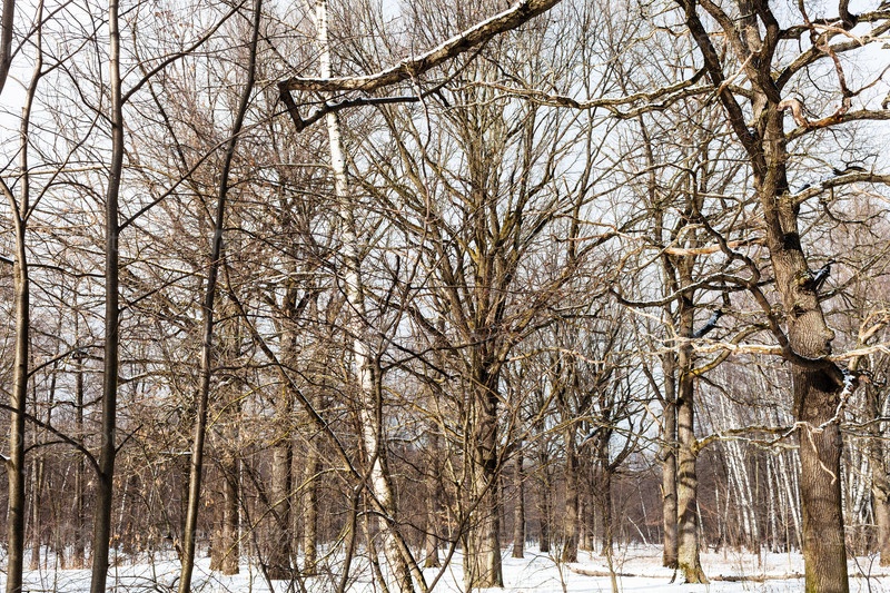Дерево в лесу, заснеженное последним весенним снегом