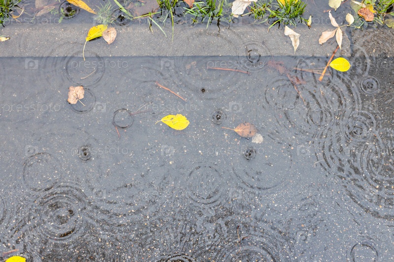 Лужа на асфальтовой дорожке под осенним дождем