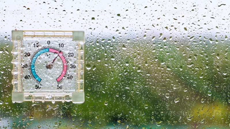Капли дождя и наружный мокрый термометр на стекле