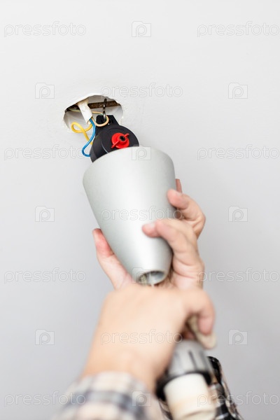 Мужчина устанавливает декоративный колпак потолочного светильника