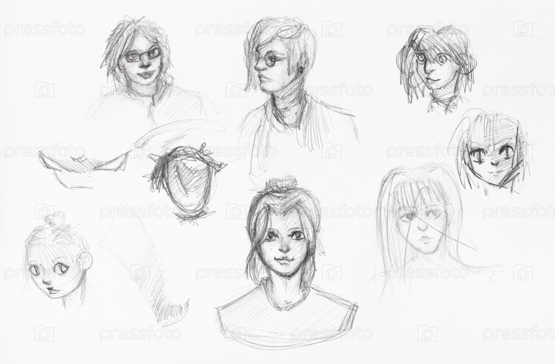 Зарисовки различных головок девочек и мальчиков