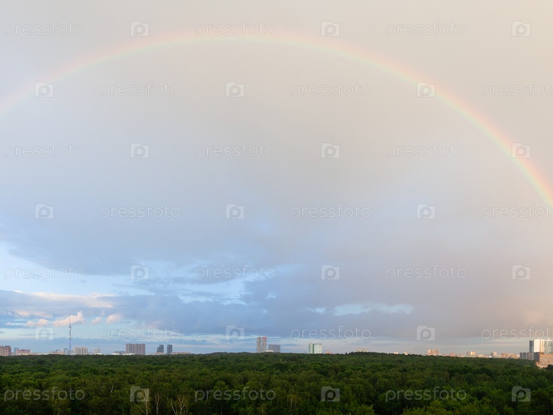 Радуга в голубом облачном небе над лесом и домами