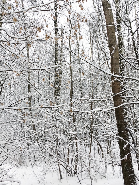 Спутанные ветки деревьев, покрытые снегом в лесу