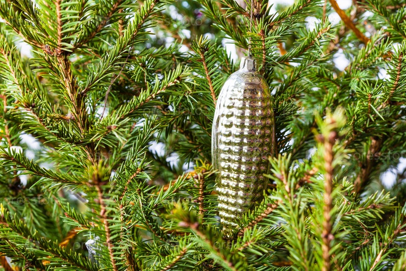 Стеклянный конус на натуральной елке крупным планом