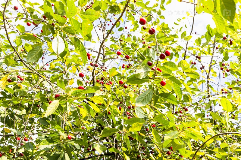 Листва и спелые плоды вишневого дерева летом